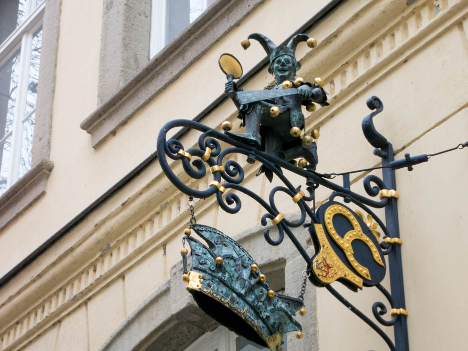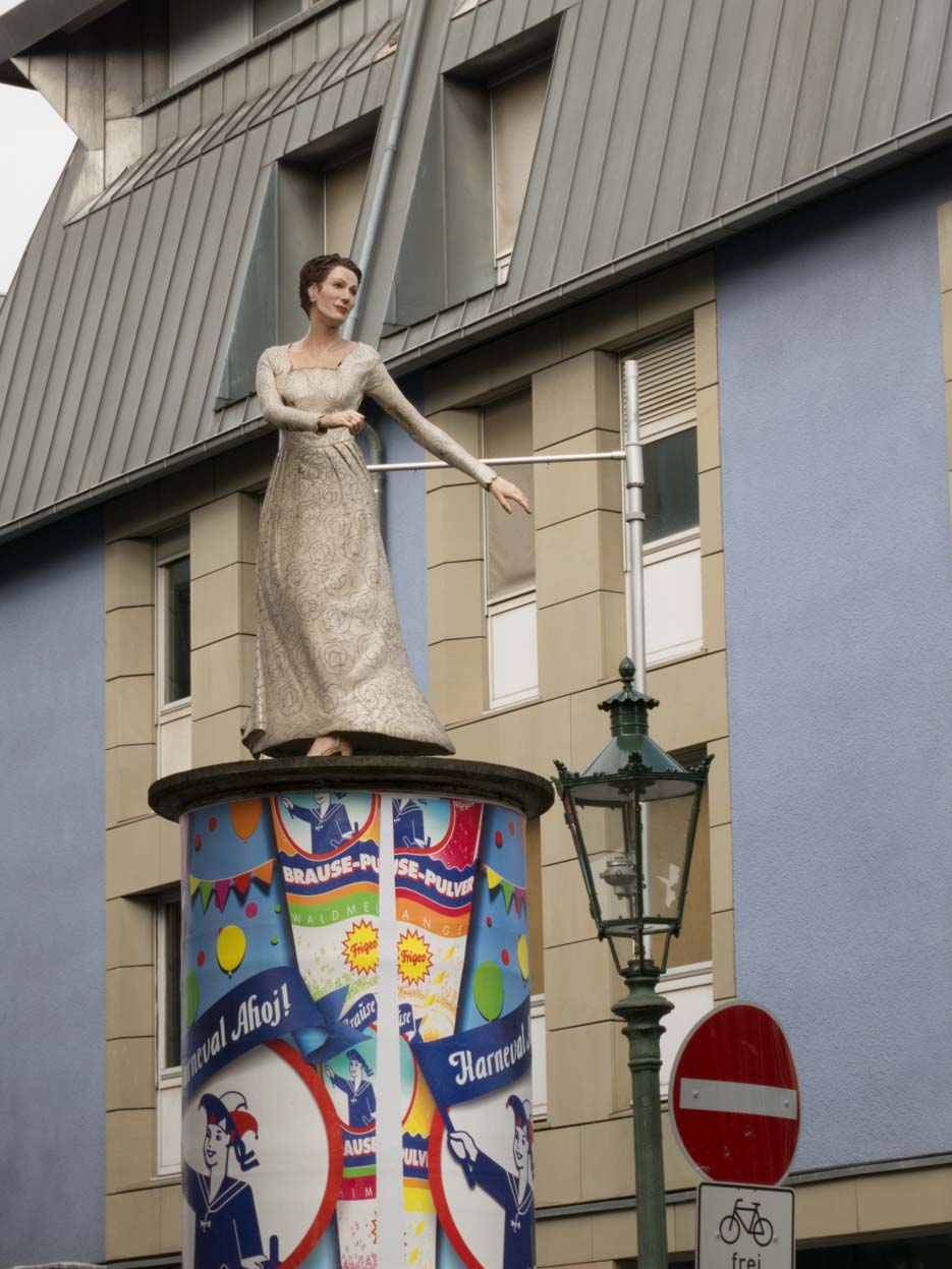 Kunst in der Altstadt: auf Litfasssäulen thronen diverse Skulpturen, die auch Säulenheilige genannt werden. Gemacht wurden sie vom Künstler Christoph Pöggeler.