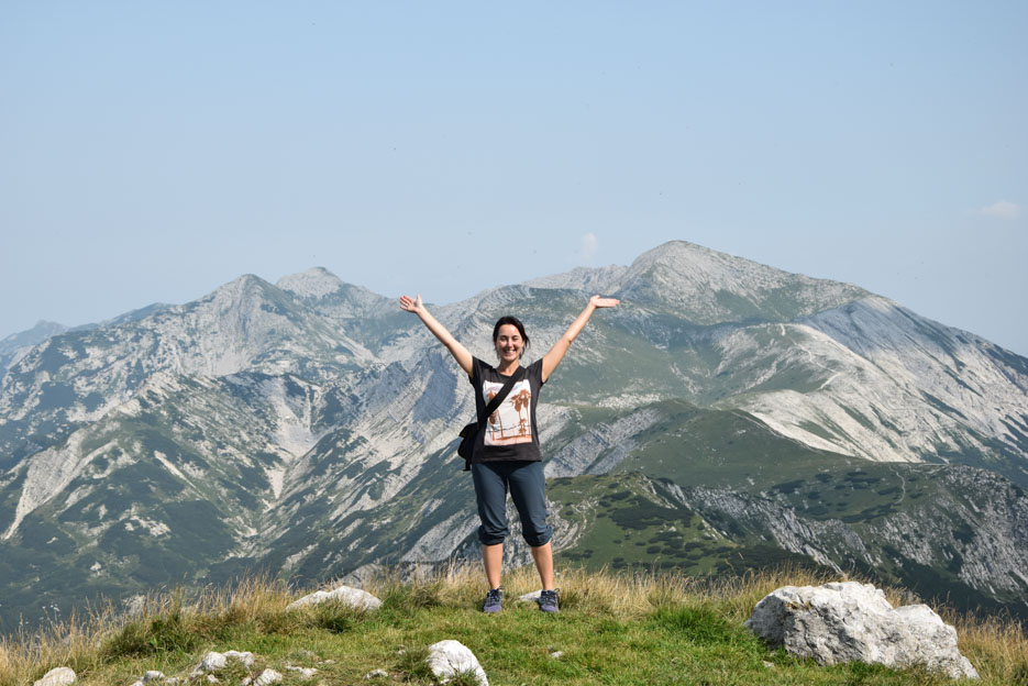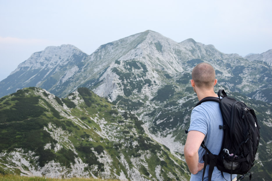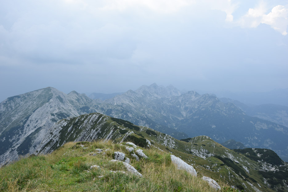 Die Aussicht wird immer weiter, das ist das Faszinierende an diesen Aufstiegen im Gebirge. Bei jeder Gelegenheit bleiben wir stehen und genießen den Ausblick für einen Moment, wohlwissend, dass er noch spektakulärer wird, je höher wir kommen. Als wir auf der Spitze des Šija (1880 m), einer Art Etappenziel stehen, eröffnet sich ein 360 Grad Rundumblick auf ein fantastisches Bergpanorama. Im Westen allerdings, nur 1 Kilomater Luftlinie entfernt, über dem Vogel, lungert eine bedrohliche, tiefschwarze Wolke wie ein unliebsamer Gast. Zu allem Überfluss ertönt regelmäßig ein bedrohliches Donnern in der Ferne.